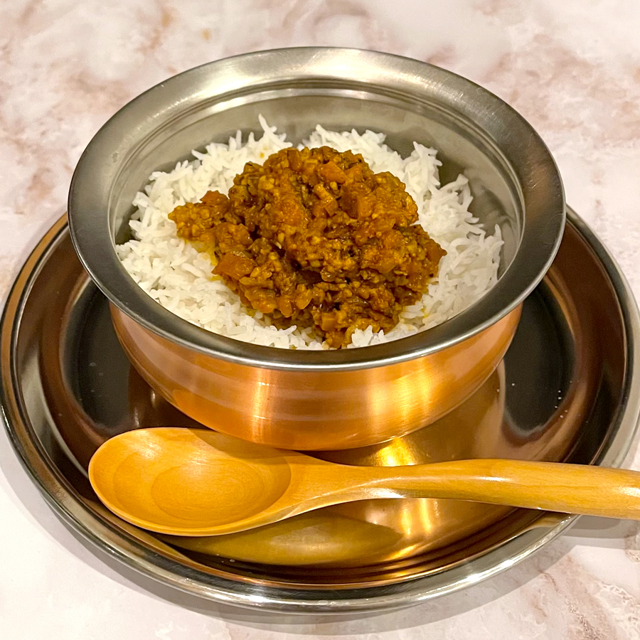 豚ひき肉を使ったキーマカレー。カレールー、辛いスパイス、小麦不使用。玉ねぎ&人参をたっぷり使い濃厚な甘さとコクを出しました。(人参嫌いなお子様にもおすすめです)そして馴染みのあるスパイスの香りがやみつきに。お子様のスプーンを止まらなくさせます。